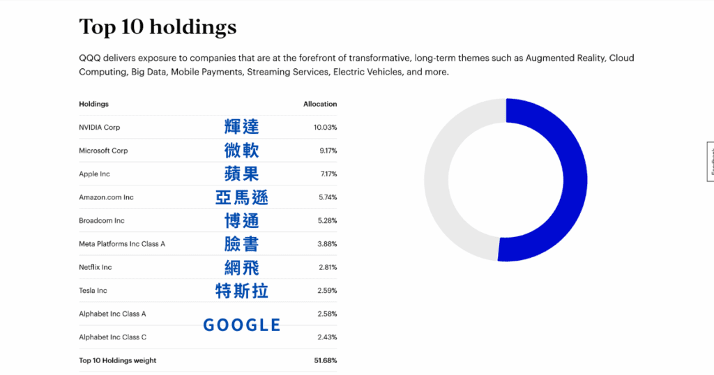 QQQ全名為Invesco QQQ,是一個追蹤納斯達克指數100的ETF,包含了在納斯達克交易所上市的前100大非金融類公司。