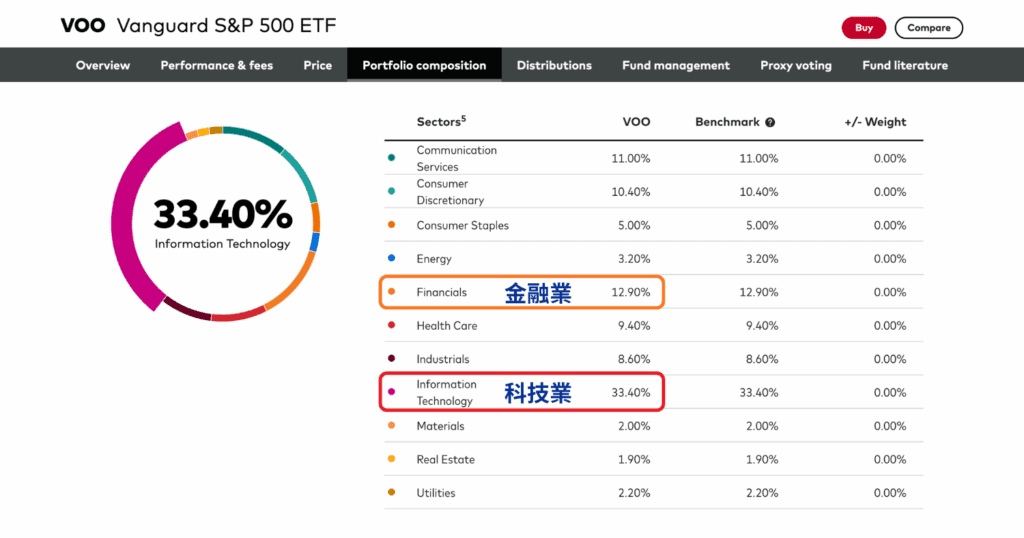VOO 產業比例組成大約有33%都是科技業、13%是金融業,記得投資ETF之前,產業比例也是值得注意的資訊!