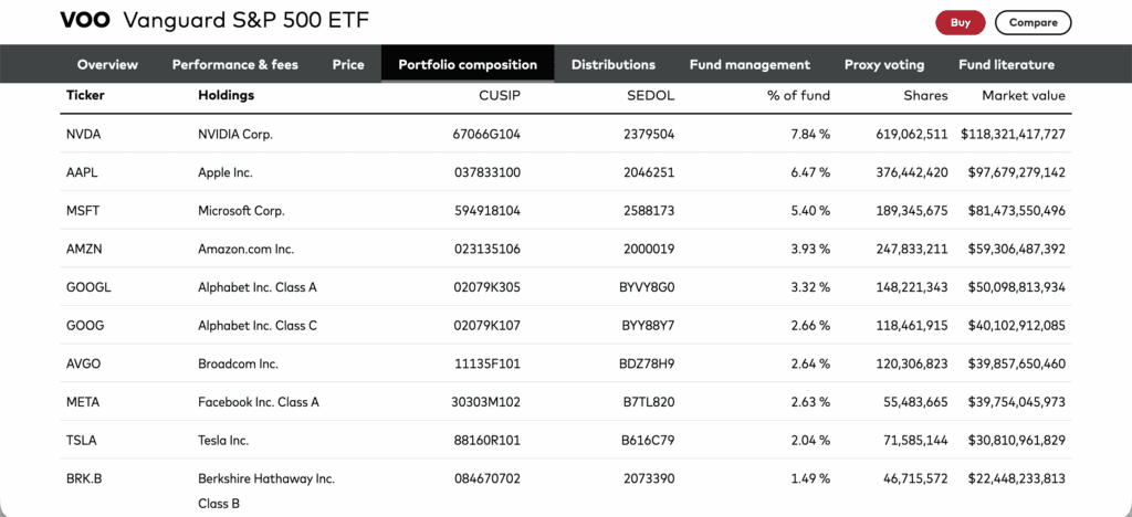 截至2026/1/31,VOO的成分股約為500檔,以當前美國市值前500大公司為主,前10名都是輝達、微軟、蘋果等知名科技公司,或是俗稱的科技七巨頭。