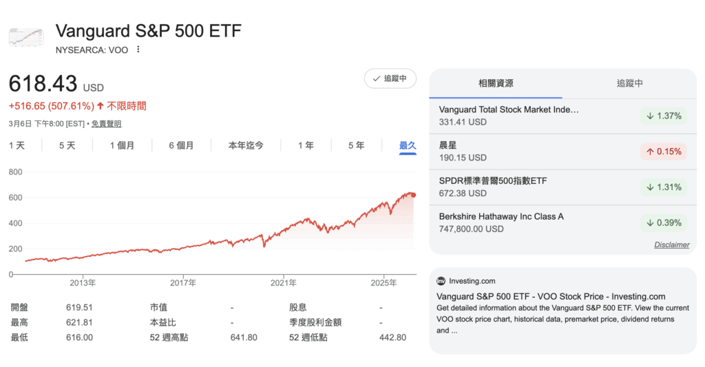 從2010/9/3至2025/7/18,VOO股價從100美元變成約618美元。